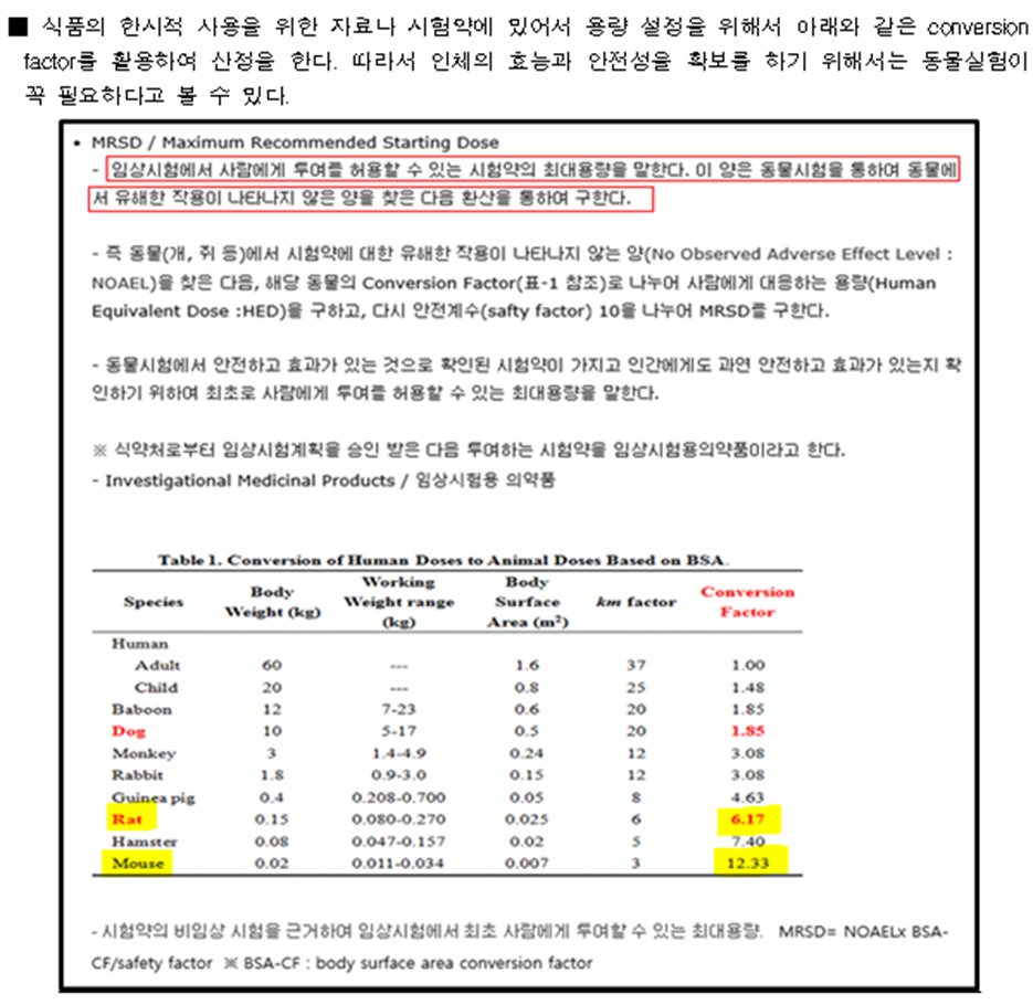 그래서 투여 용량을 인간이 먹는 용량으로 환산해서 투여를 하게되네요.