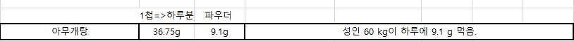 아무개탕을 파우더로 했떠니 9.1g이 나왔어요. 이게 성인 60kg이 하루에 먹을 양이에요.