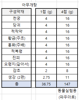 된다는 소리이지요. 그런데 우리는 한약 처방을 받으면 액상이잖아요? 그래서 그 액상을 파우더로 만들어야 계산할 수가 있어요. 그럼 예시로 아래와 같은 아무개탕이 있어요. 아무개탕 1첩은 36.75g이에요. 그런데 처방 구성 약재가 아무개탕 처럼 뿌리류가 많다면 동결된 파우더가 많이 나오지만 잎 위주로 되어 있다면 수율이 너무 적어요.